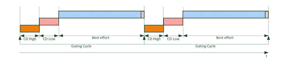 Scheduling e Shaping del traffico – Il meccanismo prevede la trasmissione ciclica di dati su base stream predefiniti in base alla priorità e tipologia del servizio, che permetterà una latenza certa e garantita inferiore ad 1ms per il traffico ad altissima priorità. Il trasferimento dei dati sulla rete è diviso in un ciclo con differenti classi di traffico detti Stream Reservation Classes, dove un ciclo è lungo 1 ms. Queste classi di priorità sono 8: sono definite le Stream Reservation Classes CD-High (per i dispositivi sincronizzati), CD-Low (per i dispositivi non sincronizzati) e Best Effort (per i dispositivi che non appartengono al dominio TSN). Le code in uscita 4 e 5 sono utilizzate per l’High e Low. In ogni ciclo sono presenti la CD-High class (100 μs), la CD-Low class (100 μs) e la Best Effort class (800 μs con una Guard Band inclusa). Il Gating Cycle è perciò 1 ms. La latenza garantita è circa 900 μs. Questo metodo è noto come Time Aware Scheduling (TAS).
