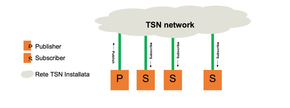 Utilizzando il modello di comunicazione OPC UA abitualmente utilizzato nell’automazione, ovvero il modello Publisher-Subscriber, ogni publisher, in una rete TSN, manderà continuamente dati, in maniera deterministica. Questi dati saranno distribuiti ai subscriber nella rete TSN e la comunicazione sarà Molti-a-Molti. In questo contesto la comunicazione M2M diventerà real-time con OPC UA PubSub basato su TSN.