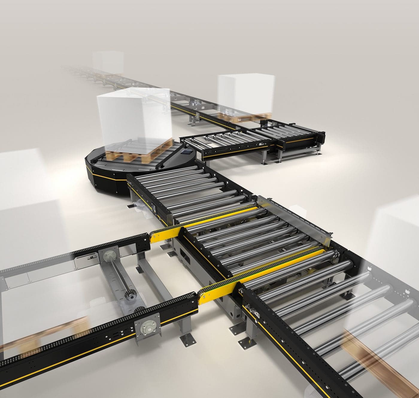 Rispetto al sistema di stoccaggio dinamico, dove i bancali vengono bufferizzati in strutture di stoccaggio intermedie su binari inclinati mediante gravità, la MPP rappresenta un sistema per il trasporto motorizzato dei pallet. A seconda dello scenario applicativo, l’azionamento avviene tramite motoriduttori o mototamburi, per cui è possibile realizzare anche linee di trasporto prive di accumulo.