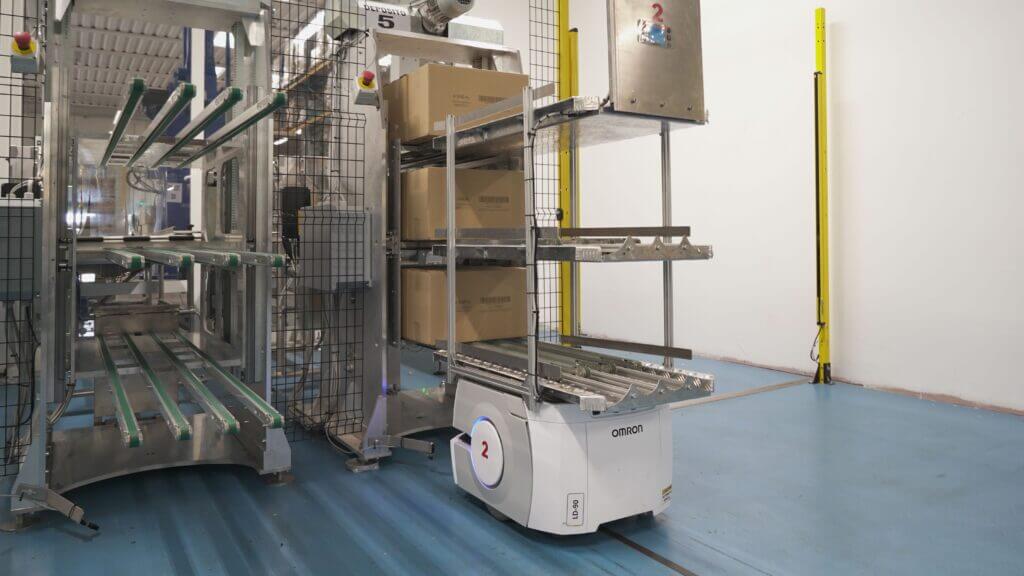 Il progetto di ammodernamento è stato curato dal team di FM Vision che, grazie alla tecnologia e alla consulenza di Omron, ha fornito una soluzione completamente automatizzata basata sull’impiego di cinque robot mobili autonomi in grado di effettuare le operazioni di carico/scarico dei lotti confezionati dal fine linea verso le stazioni robotizzate di pallettizzazione.