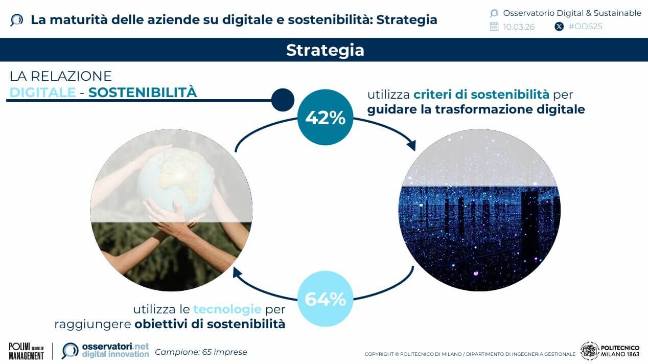 Nonostante i buoni presupposti, la sinergia tra i due ambiti resti limitata: il 64% delle imprese sfrutta il digitale per scopi ESG, ma solo il 42% orienta le scelte tecnologiche in base a criteri sostenibili.
