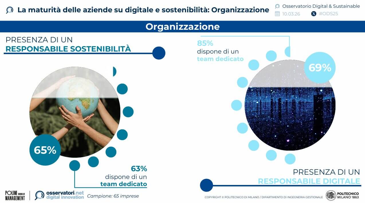 Sotto il profilo organizzativo, sebbene i responsabili per il digitale e la sostenibilità siano presenti in due aziende su tre, i team dedicati sono più frequenti nell’ambito tecnologico rispetto a quello ambientale e sociale. La funzione sostenibilità occupa posizioni variabili negli organigrammi, riportando talvolta al CEO o agendo a supporto di altre divisioni.