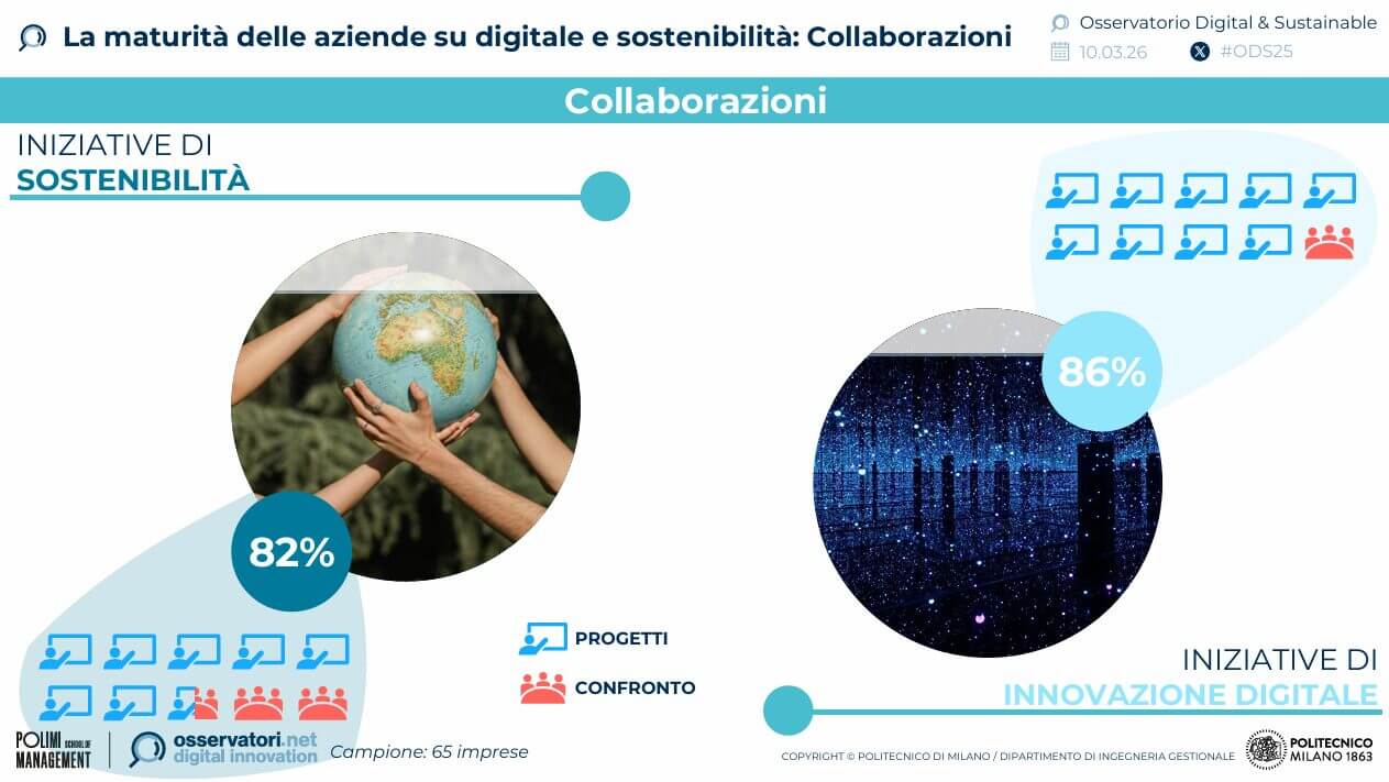 Anche le collaborazioni esterne sono consolidate: l’82% delle aziende collabora su temi di sostenibilità e l’86% nel digitale. Mentre nel secondo caso le partnership puntano a progetti concreti, nel primo si registra un’apertura significativa verso la condivisione di buone pratiche.