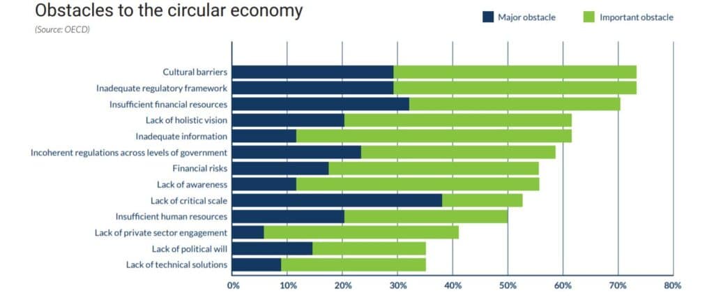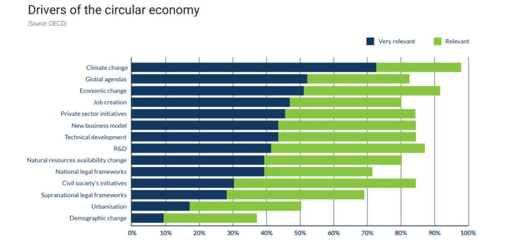 Lo confermano anche i dati dell’Ocse, secondo cui i principali fattori di spinta verso la transizione a un’economia circolare sono il cambiamento climatico (73%), gli obiettivi globali (52%) e cambiamenti socio-economici (51%), a cui si aggiungono proprio la creazione di nuovi posti di lavoro (47%), iniziative del settore privato (46%), nuovi modelli di business (43%), sviluppo tecnologico e attività di ricerca e sviluppo (entrambi al 43%).
