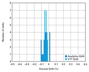 La fase 1, nella quale 19 dispositivi in funzione sono stati rimossi dall’esercizio per eseguire i test di precisione, si è conclusa a ottobre 2018. La fase 2, in cui gli stessi 19 dispositivi sono stati sottoposti a test di invecchiamento accelerato da parte di VTT/Mikes, si è conclusa a novembre 2019. Prima della prova, test con apparecchiature di misura ad alta accuratezza sono stati eseguiti per stabilire valori di precisione di riferimento per tutti i dispositivi e per poterne poi valutare la deriva. I risultati della deriva riscontrata da VTT/Mikes e dal servizio di analisi dopo la fase 2 sono mostrati nella Figura 3.