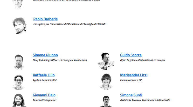 Oltre a Diego Piacentini e Paolo Barberis, Consigliere per l’Innovazione del Presidente del Consiglio dei Ministri, faranno parte del “Team per la Trasformazione Digitale”, istituito presso la Presidenza del Consiglio dei Ministri, Simone Piunno, Chief Technology Officer – Tecnologia e Architettura; Raffaele Lillo, Applied Data Scientist; Giovanni Bajo, Relazioni Sviluppatori; Guido Scorza, Affari Regolamentari nazionali ed europei; Marisandra Lizzi, Comunicazione e PR; Simone Surdi, Assistente Tecnico e Coordinatore delle attività. I decreti di nomina di queste figure sono in fase di registrazione presso la Corte dei Conti.