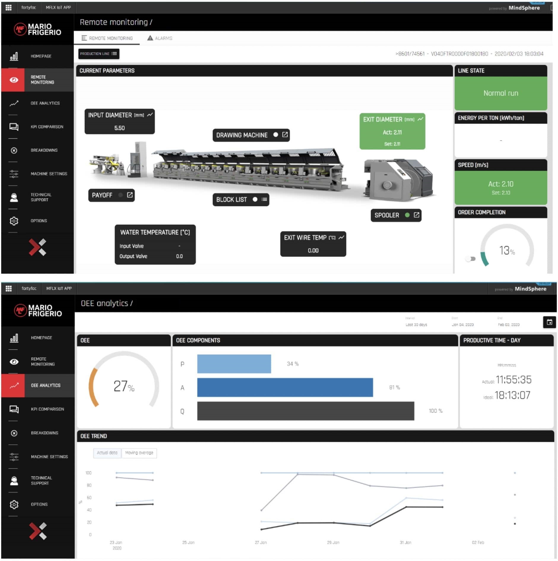 Il sistema sviluppato, che gira sulla piattaforma in cloud MindSphere – sempre con approccio “edge + cloud” -, offre in tempo (quasi) reale informazioni sui parametri critici delle macchine, dalle temperature ai consumi elettrici, oltre a una serie di schermate sinottiche sui key performance indicator relativi all’efficienza dell’impianto (OEE): produttività, disponibilità e qualità.