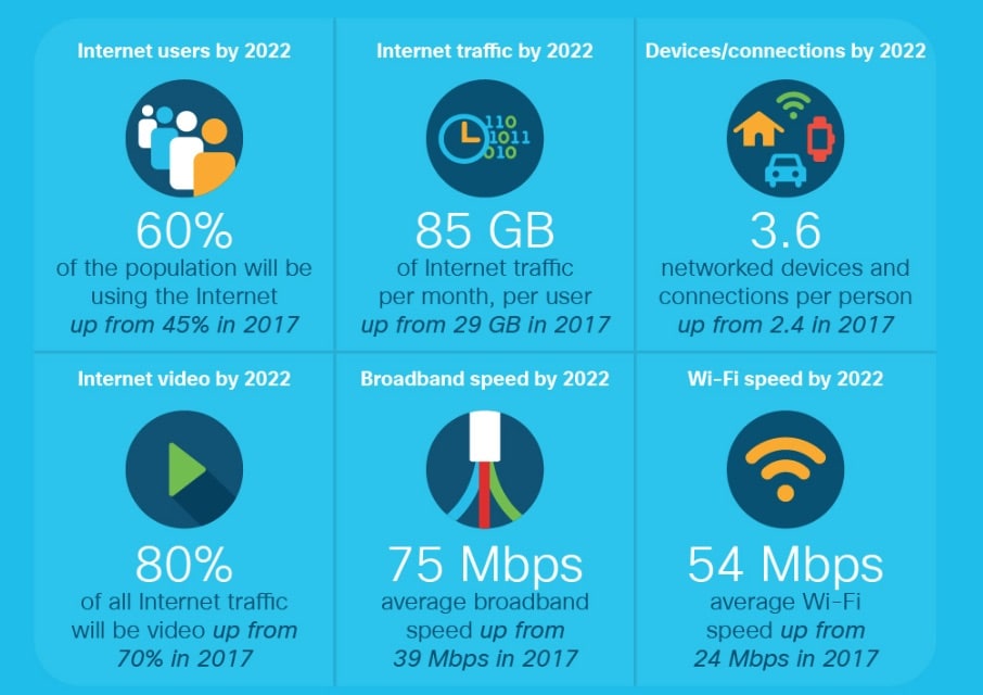 La ricerca VNI di Cisco guarda all’impatto che utenti, device e altri trend avranno sulle reti IP di tutto il mondo su un arco di cinque anni. Fra il 2017 e il 2022, Cisco prevede in particolare questo.