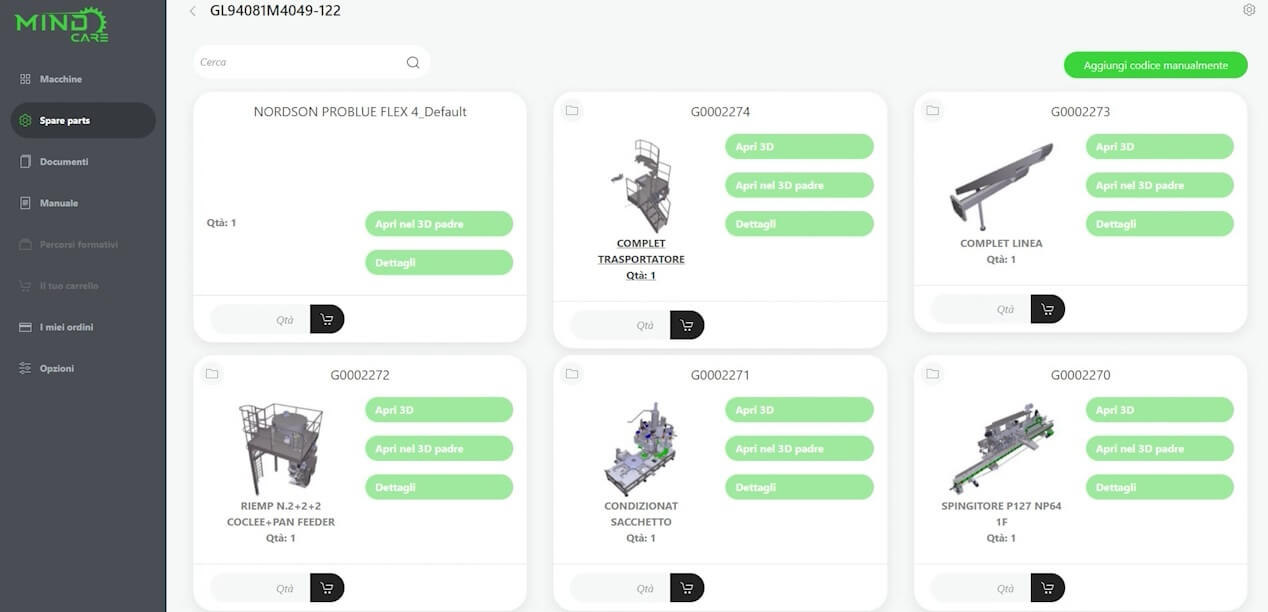 Navigando tra i modelli 3D, gli utenti potranno indentificare in modo semplice i ricambi e ordinarli attraverso il catalogo online. Non solo, su Mind Care il concetto di manuale operatore della macchina è completamente rivisto: qui è realizzato con video, animazioni e training online.