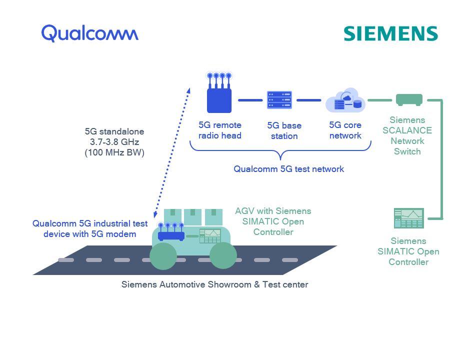 Qualcomm ha installato dispositivi di test industriali 5G insieme ad una rete di test 5G standalone che include una rete centrale 5G e una stazione base 5G con testa radio remota. Siemens ha fornito la configurazione industriale vera e propria, compresi i sistemi di controllo Simatic e i dispositivi IO, e i device industriali, come veicoli a guida autonoma (AGV).