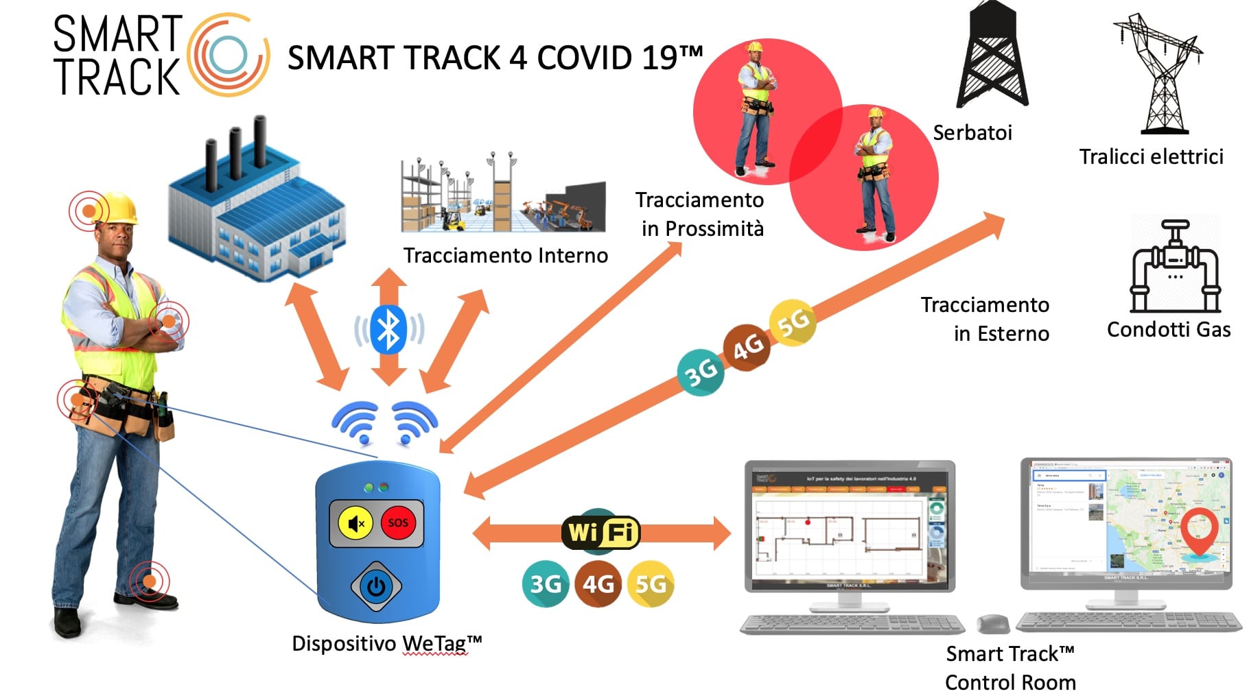 Il modulo Smart Track 4 Covid19 è una estensione della piattaforma IoT connected worker già attiva in rilevanti industrie italiane per la rapida gestione di eventi di emergenza in ambienti complessi come centrali termoelettriche, stabilimenti ed acciaierie. La nuova release è stata sviluppata per fornire un concreto aiuto per contrastare la diffusione del Covid-19 e supportare la filiera produttiva per la ripresa delle attività aumentando la sicurezza dei lavoratori, i veri artefici del successo delle aziende.