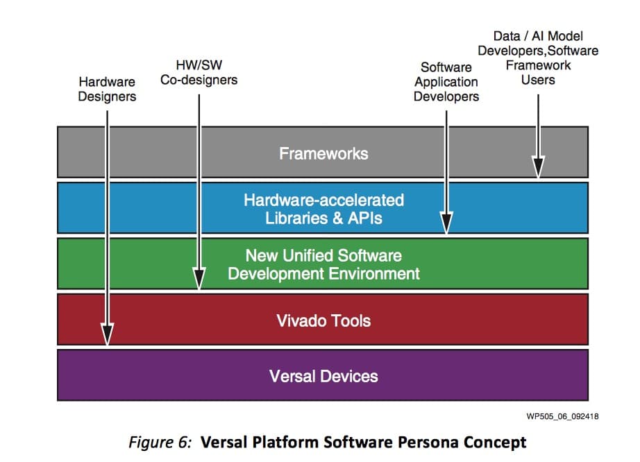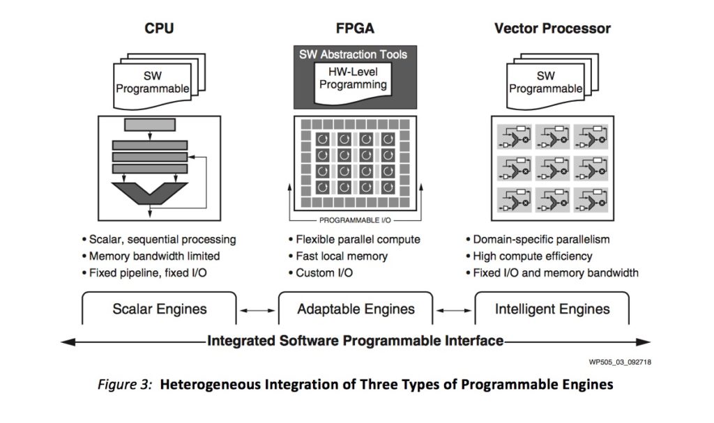 Le alternative generalmente prese in considerazione dai produttori sono state l’utilizzo di processori vettoriali e DSP, per esempio contenuti nelle GPU, e l’impiego di logica programmabile basata su FPGA. Tutte e tre le tecnologie presentano vantaggi e svantaggi, poiché ciascuna di esse è più adatta per alcuni compiti e meno per altri. Tuttavia, se si riuscisse a realizzare una piattaforma che contenesse risorse di calcolo di tutti e tre i tipi, ma gestibile e soprattutto programmabile con facilità, si avrebbe in mano uno strumento capace di far fronte a ogni esigenza elaborativa. Ebbene, questa è più o meno l’idea alla base della piattaforma adattiva Xilinx ACAP Versal.