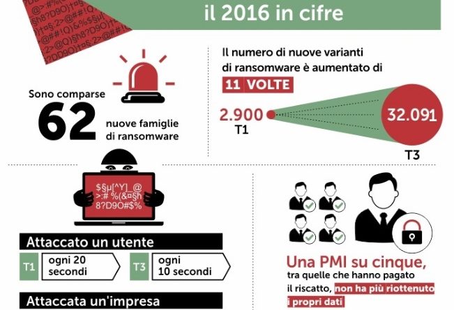 Quest’anno gli attacchi alle aziende con ransomware – il malware che infetta i dispositivi e ne cripta il contenuto chiedendo un riscatto in cambio della chiave di cifratura – sono triplicati, passando da un attacco ogni due minuti a gennaio a uno ogni 40 secondi a ottobre 2016.