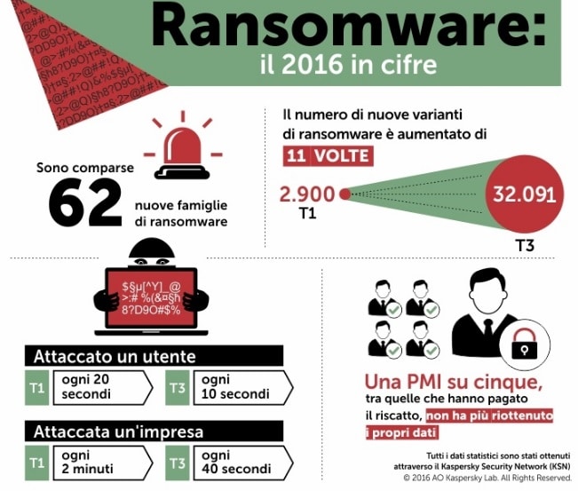 Secondo l’indagine “Kaspersky Security Bulletin 2016 – Story of the Year: The Ransomware Revolution” di Kaspersky Lab, fornitore di soluzioni per la security, un’azienda su cinque nel mondo ha subito un incidente di sicurezza IT a seguito di un attacco ransomware e, tra le imprese più piccole, una su cinque non ha mai ottenuto indietro i propri file, anche dopo aver pagato il riscatto.