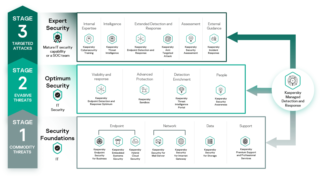 Insieme a questo nuovo prodotto, Kaspersky presenta anche nuovi framework volti a soddisfare le esigenze delle aziende in termini di difesa dalle minacce e in base al livello di maturità della loro sicurezza IT. Kaspersky MDR potenzia ogni framework abilitando una funzione di sicurezza IT consolidata e consentendo ai team di esperti di sicurezza IT di focalizzarsi sulla gestione degli eventi critici evidenziati: