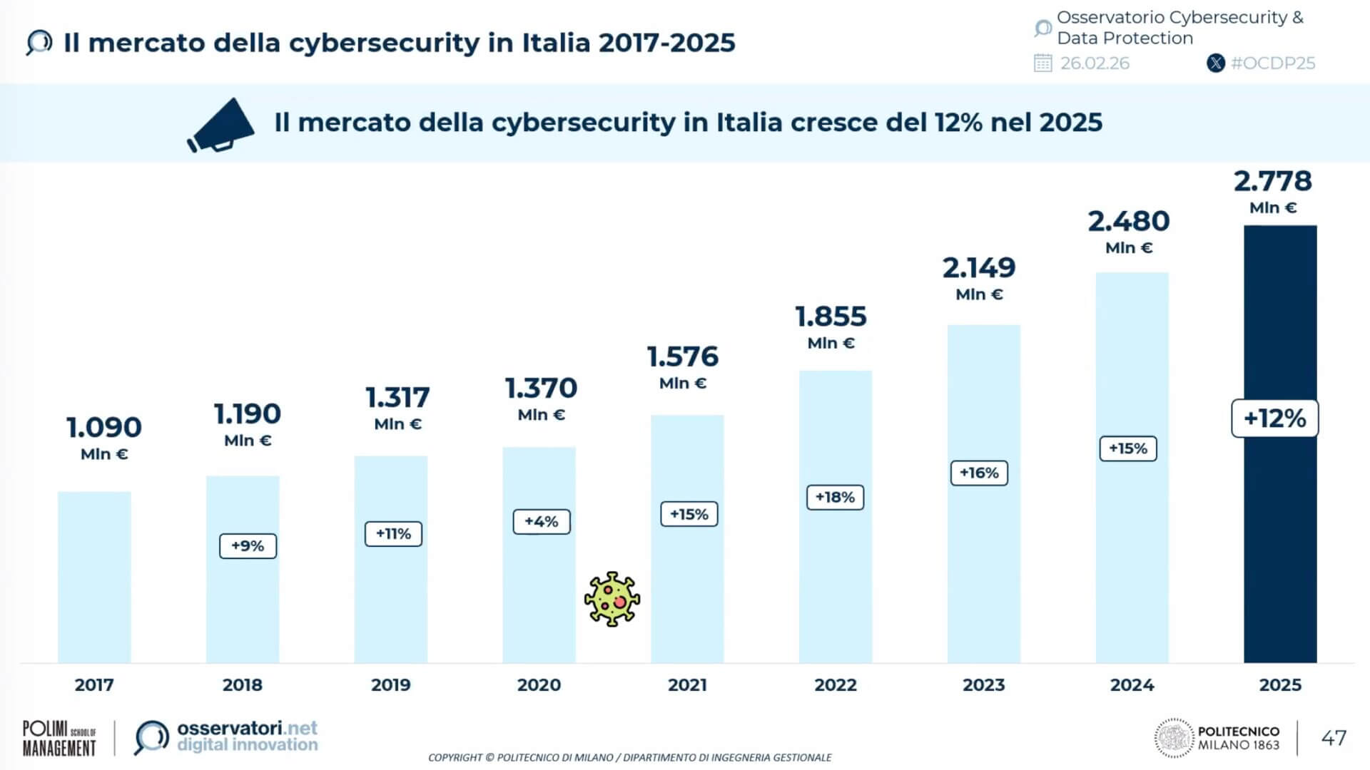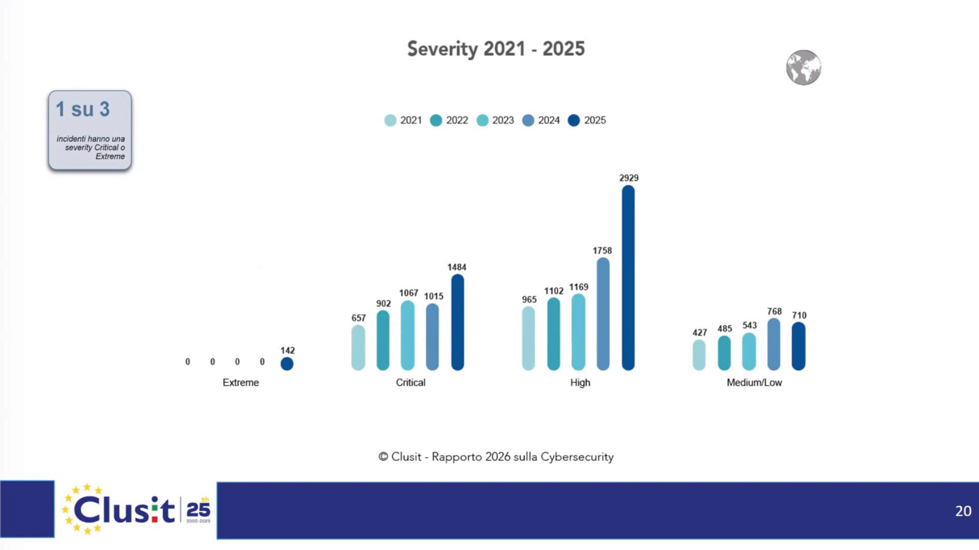 Nel corso del 2025 gli incidenti informatici gravi rilevati a livello mondiale hanno raggiunto quota 5.265, con un aumento del 49% rispetto all’anno precedente. Il dato – che fa segnare un record assoluto – è contenuto nel Rapporto Clusit 2026, che sarà presentato al pubblico il 17 marzo in apertura del Security Summit di Milano.