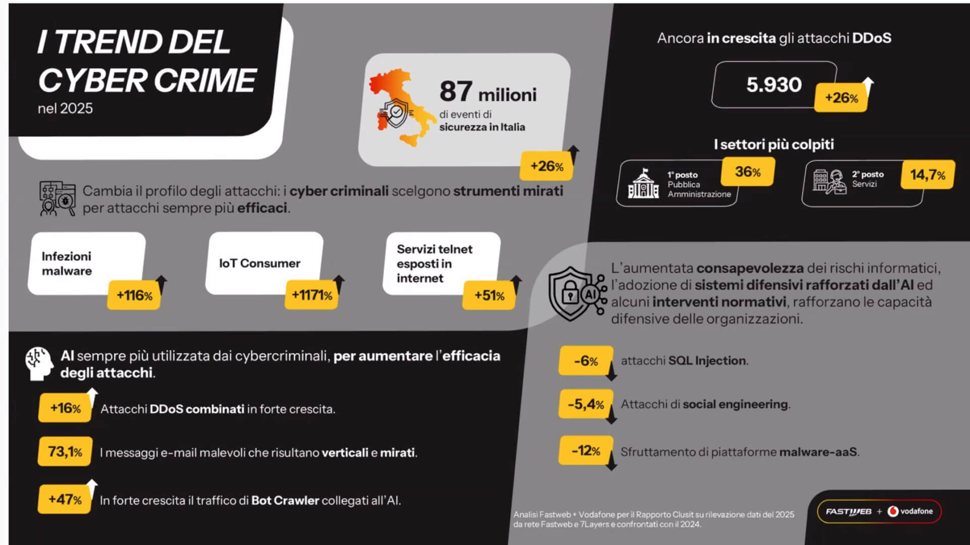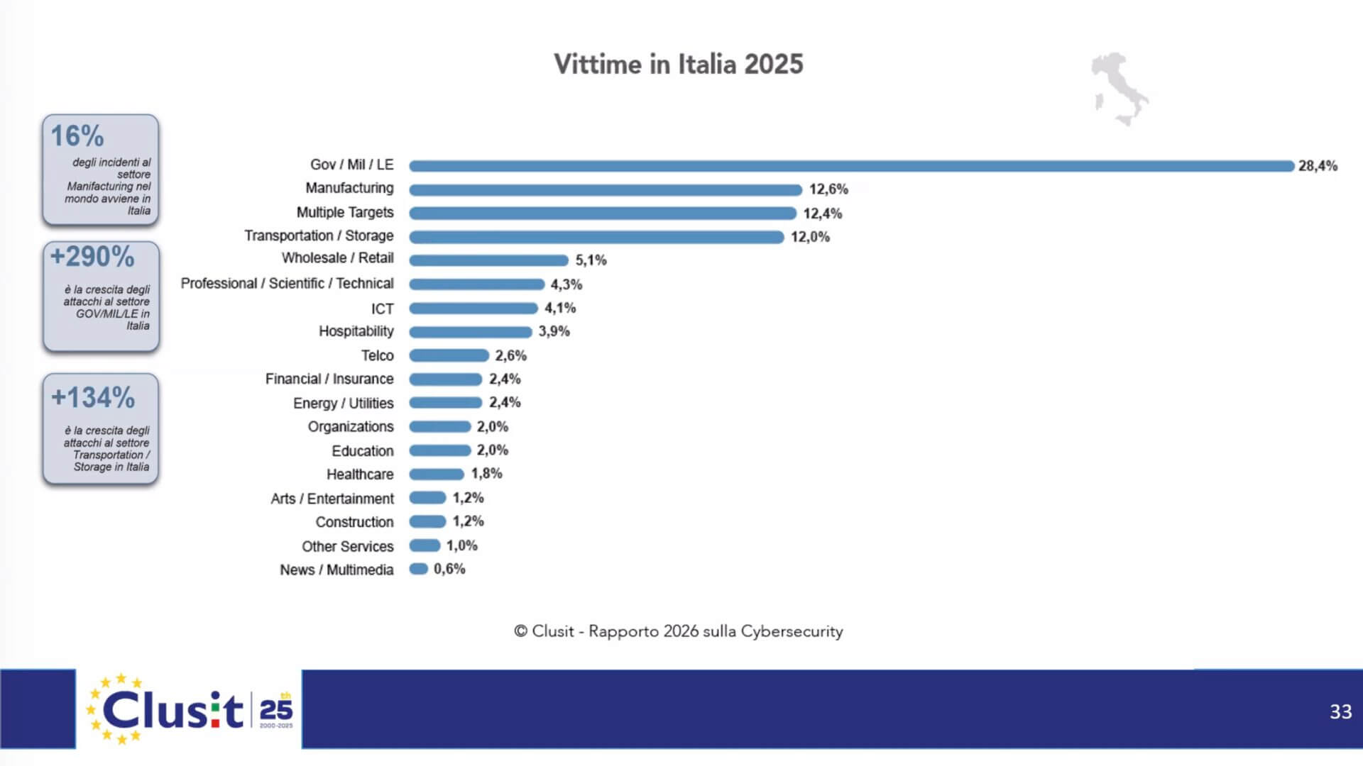 A livello globale gli attacchi cyber gravi sono cresciuti del 49% rispetto all’anno precedente, raggiungendo quota 5.265 incidenti. Anche in Italia si registra una forte crescita: gli attacchi sono in aumento del 42%. Il Belpaese continua a essere un bersaglio estremamente attraente per i criminali informatici, arrivando ad assorbire il 9,6% degli incidenti totali censiti nel mondo. E contro aziende italiane è indirizzato il 16% degli attacchi globali al settore manifatturiero. I dati del rapporto Clusit 2026.