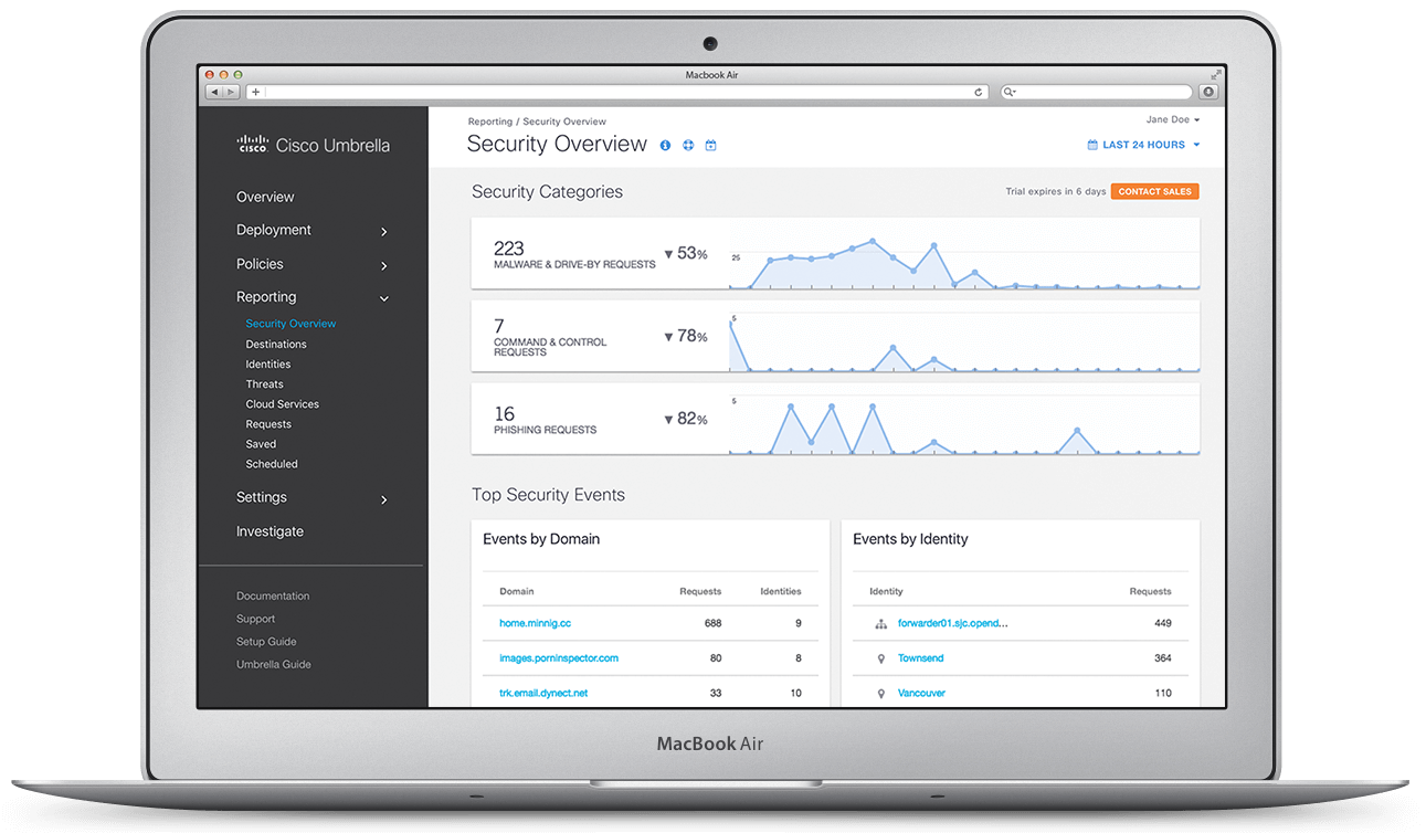 Cisco Umbrella è una piattaforma di sicurezza che fornisce una prima linea di difesa per proteggere i dipendenti dentro e fuori la rete aziendale. Umbrella blocca le minacce verso tutte le porte e i protocolli, garantendo così una protezione totale. Blocca l’accesso a domini, URL, IP e file maligni prima che venga stabilita la connessione o scaricato un file, garantendo copertura di tutto il traffico. Con Umbrella, proteggersi non è mai stato così semplice. Dato infatti che tutto avviene in cloud, non c’è hardware da installare e non c’è software da aggiornare manualmente. Le aziende possono in questo modo proteggere tutti i dispositivi: bastano pochi minuti per indirizzare il traffico Internet verso Umbrella sia all’interno che all’esterno della rete aziendale.