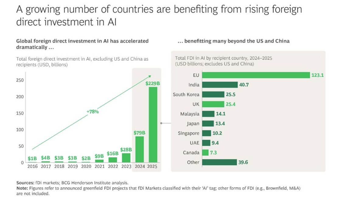 A far emergere un ecosistema sempre più interconnesso è l’accelerazione dei flussi di investimenti internazionali: tra il 2016 e il 2025 gli investimenti diretti esteri nell’AI sono cresciuti di circa 200 volte, con un numero di progetti annuali aumentato di circa 20 volte.