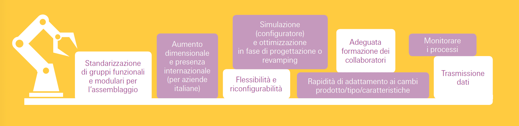 Nonostante l’adozione diffusa di diverse tecnologie, il settore si dimostra comunque assetato di innovazione. Per il prossimo futuro l’interesse – stando a quanto emerge dall’analisi – è catturato in particolar modo dai software basati sull’intelligenza artificiale, dalla sensoristica avanzata, dalla crescente elettrificazione degli attuatori e da soluzioni per la gestione del dato digitale, dall’RFID a IOLink. A cosa serviranno queste tecnologie? Ad accrescere flessibilità e riconfigurabilità delle linee e a ridurre i tempi necessari a gestire i cambi prodotto.