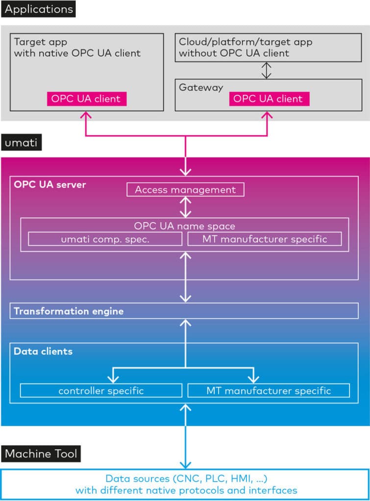 Umati si propone di diventare lo standard per il collegamento delle macchine utensili ai sistemi IT nell’ambiente di produzione (integrazione verticale), per consentire alle macchine utensili e alle periferiche di collegarsi agli ecosistemi IT specifici del cliente in modo semplice, sicuro e senza soluzione di continuità.