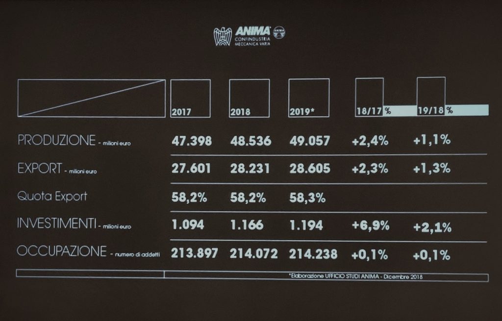 Il dato più interessante però è quello relativo agli investimenti delle aziende del comparto, cresciuti del 6,9% a quota 1.166 milioni e previsti in ulteriore crescita del 2,1% per il 2019. Investimenti che, spiega Paolo Galloso, responsabile dell’Ufficio Studi Anima, hanno avuto “un’intensità sorprendente” e sono andati prevalentemente in macchinari innovativi, anche grazie agli incentivi previsti dal piano Industria 4.0.