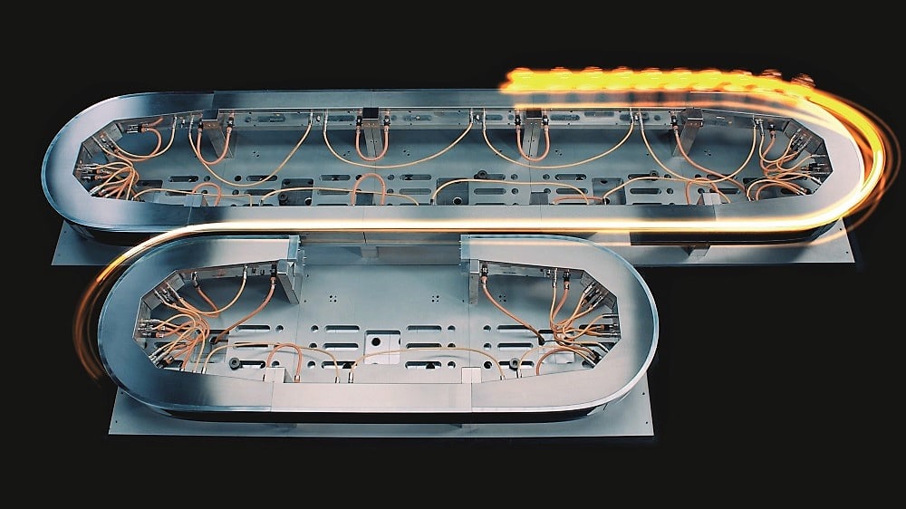 I carrelli sono ancorati alla pista tramite una rotella con profilo a V, ma in realtà lo shuttle non tocca la struttura perché il movimento è garantito da un azionamento accoppiato magneticamente. In questo modo è possibile azzerare attriti, vibrazione e usura delle parti, massimizzando la velocità e la stabilità dei carrelli. Non solo: grazie all’accoppiamento magnetico su entrambi i lati degli shuttle, è possibile realizzare dei passaggi tra piste alla massima velocità e completamente esenti da usura perché non c’è alcun tipo di scambio meccanico.