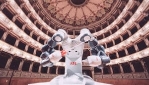 YuMi è un cobot, cioè un robot collaborativo, l’unico sul mercato ad avere due bracci anziché uno solo. Pensato per collaborare con gli operatori umani nelle operazioni di assemblaggio elettronico, ieri è stato “costretto” a dismettere i panni dell’operaio e a vestire quelli del direttore d’orchestra. E così ha diretto il tenore italiano Andrea Bocelli durante un concerto di beneficienza tenuto al Teatro Verdi di Pisa per il Galà del Primo Festival Internazionale della Robotica. Oltre 800 illustri ospiti provenienti da tutto il mondo hanno apprezzato il concerto “A Breath of Hope: dallo Stradivario al Robot”. Le sfumature gestuali di un direttore d’orchestra sono state completamente riprodotte a un livello di precisione impensabile prima d’ora.