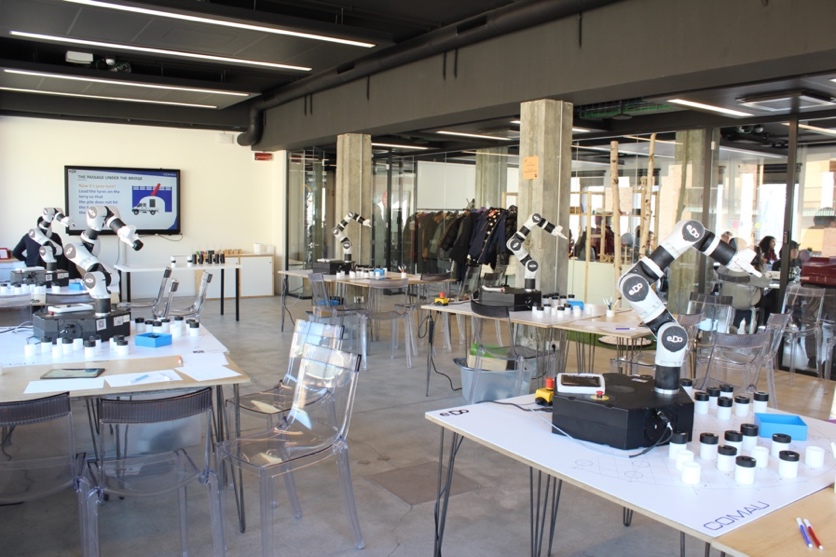 Il layout del laboratorio è lo stesso per quanto riguarda la scuola primaria e la scuola secondaria di II grado: i cinque tavoli sono posizionati in modo da formare una semiellisse e, al di sopra di questi, si trovano i cinque e.DO. La disposizione dell’aula cambia per gli studenti della scuola secondaria di I grado: i robot utilizzati, che sono quattro e non più cinque, vengono posizionati in fondo all’aula su altrettanti tavoli, disposti in modo da creare uno spazio che assume la forma di un quadrato e, al suo interno, vengono svolte le attività. I restanti tavoli sono disposti su due file nella parte anteriore dell’aula, che viene utilizzata per la spiegazione teorica da parte del facilitatore.