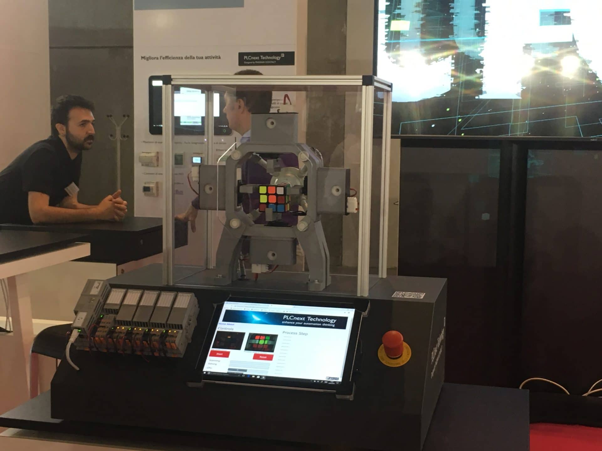 Un robot in grado di muovere le facce del cubo di Rubik e di risolvere il gioco. La dimostrazione è stata presentata da Phoenix Contact nel corso della fiera SPS Italia 2019 a Parma, per mostrare l’utilizzo del controllore PLCnext. La situazione ha dato il via anche a sfide con passanti curiosi, alcuni dei quali hanno battuto il robot risolvendo in minor tempo il cubo.