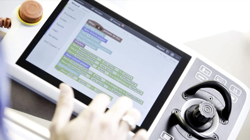 Basato su semplici blocchi grafici, Wizard Easy Programming rende facile per i non specialisti la programmazione dei propri robot. I blocchi rappresentano azioni come: “spostarsi nella posizione”, “raccogliere un oggetto” e “ripetere i movimenti”, rendendo facile e intuitivo costruire una serie di semplici passaggi che il robot deve eseguire. Ci sono anche funzioni per la gestione degli errori, che consentono ai programmatori inesperti di risolvere errori come le collisioni.