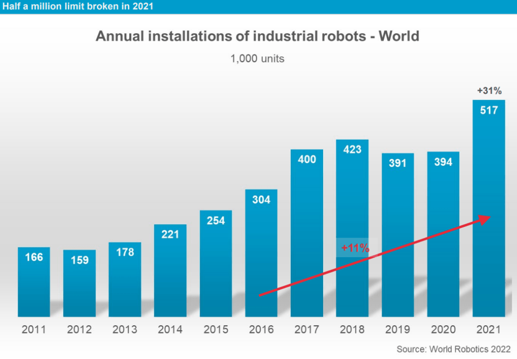Dopo la pausa del primo anno di pandemia, nel 2021 la robotica è tornata a crescere e lo ha fatto a un ritmo molto elevato. Secondo i dati diffusi dall’IFR, la Federazione Internazionale della Robotica, sono oltre mezzo milione (517.385) i nuovi robot installati, con un tasso di crescita del 31% su base annua, che portano a superare i 3,5 milioni di robot in funzione nelle fabbriche di tutto il mondo. In sei anni le installazioni annuali di robot sono più che raddoppiate.