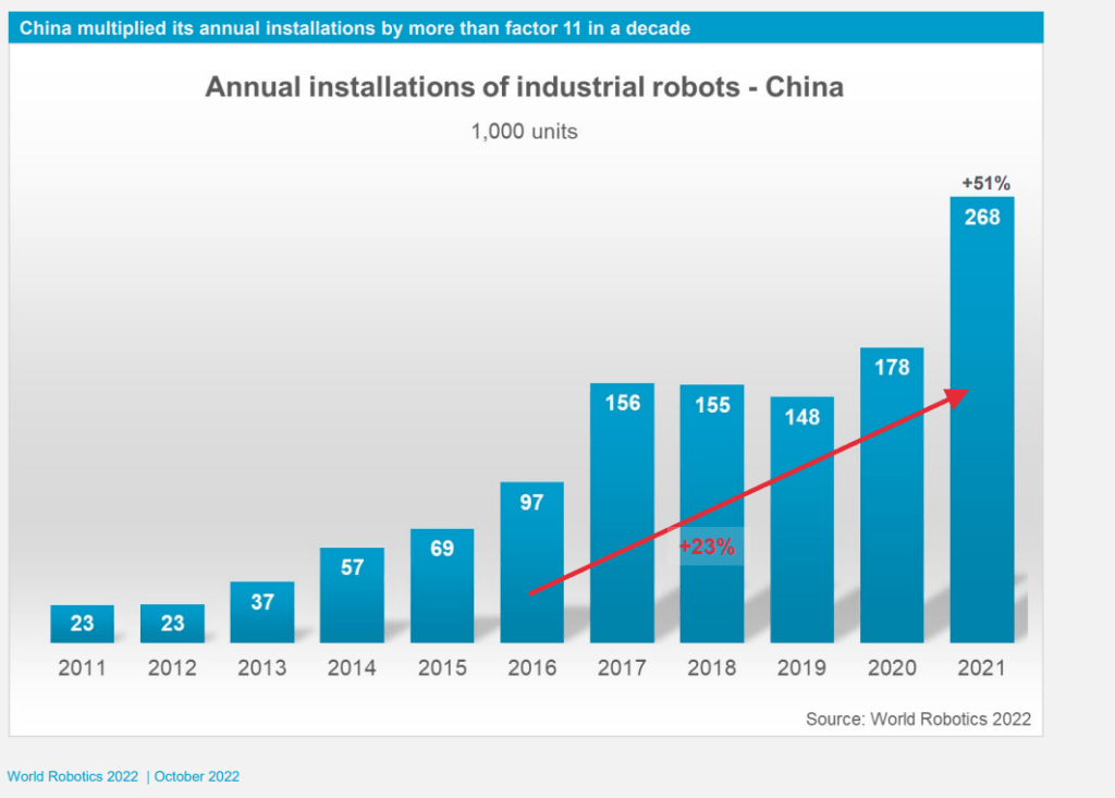 “A portare i risultati del 2021 sono stati gli effetti del recupero dalla pandemia di Covid19 e gli acquisti anticipati in vista della riduzione dei crediti d’imposta nel 2022. Il Paese aveva visto diversi anni di forte crescita e la pandemia non ha ostacolato la domanda di robot”, aggiunge Bill.
