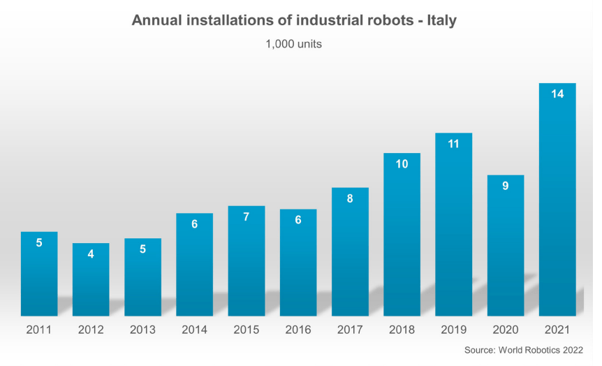Le installazioni di robot in Italia sono aumentate del 65% raggiungendo le 14.083 unità nel 2021, l’anno di maggior successo nella storia del Paese.