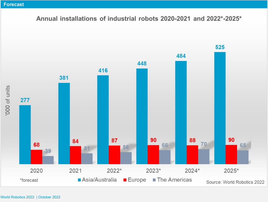 L’Asia si conferma il più grande mercato mondiale per i robot industriali: in Asia infatti si è istallato il 74% del totale dei robot istallati nel 2021(nel 2020 era il 70%).