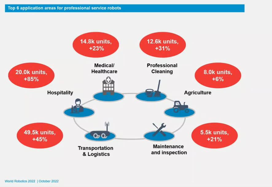 Un trend già visibile, con il mercato di robot di servizio per applicazioni professionali che, dopo il significativo aumento di vendite nel 2020, registra un’ulteriore crescita del 37% sull’anno precedente, con 121.000 unità istallate.