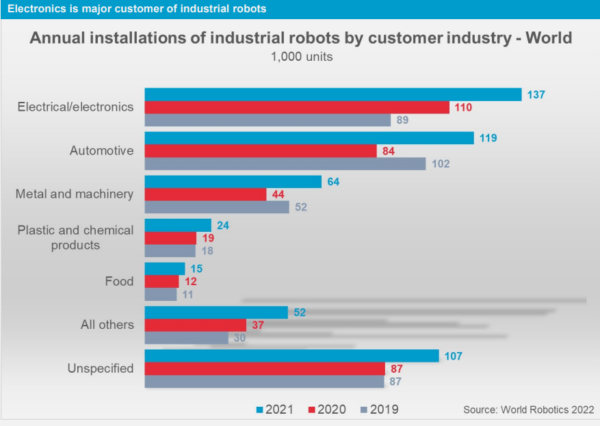 Tutti i settori hanno riportato una crescita forte e a doppia cifra nel 2021. L’elettronica si conferma il primo mercato di destinazione dei robot, con 137.000 unità istallate nel 2021, in aumento del 24% sul 2020.