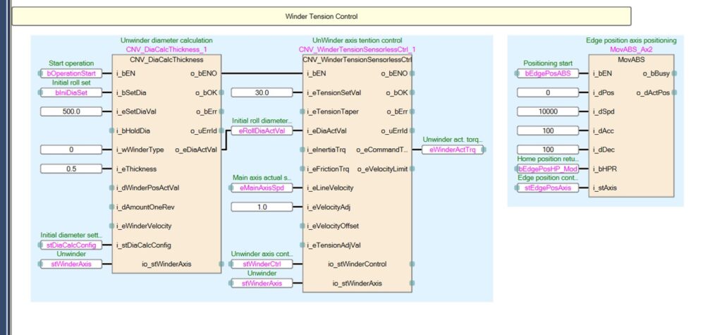 Le librerie sono composte da PLC Function Block ampiamente testati, che svolgono determinati compiti come la gestione del coltello di taglio, il controllo degli svolgitori, la funzione di servodiametro, il taglio al volo, il controllo tensione sensorless, ecc. All’utente basterà quindi solo parametrizzare le funzioni della macchina, senza lo sviluppo completo del software di gestione che comporterebbe un grande investimento di tempo.